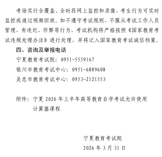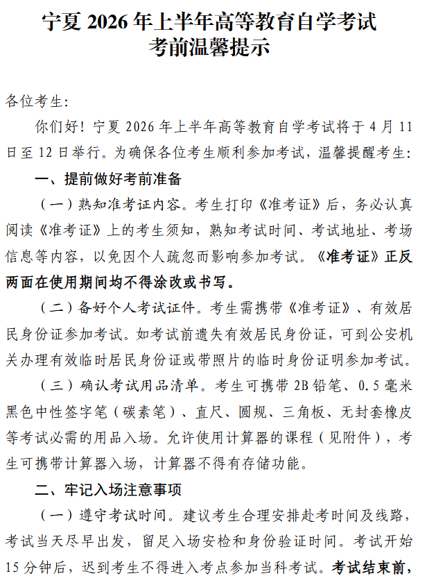 宁夏2026年上半年高等教育自学考试考前温馨提示