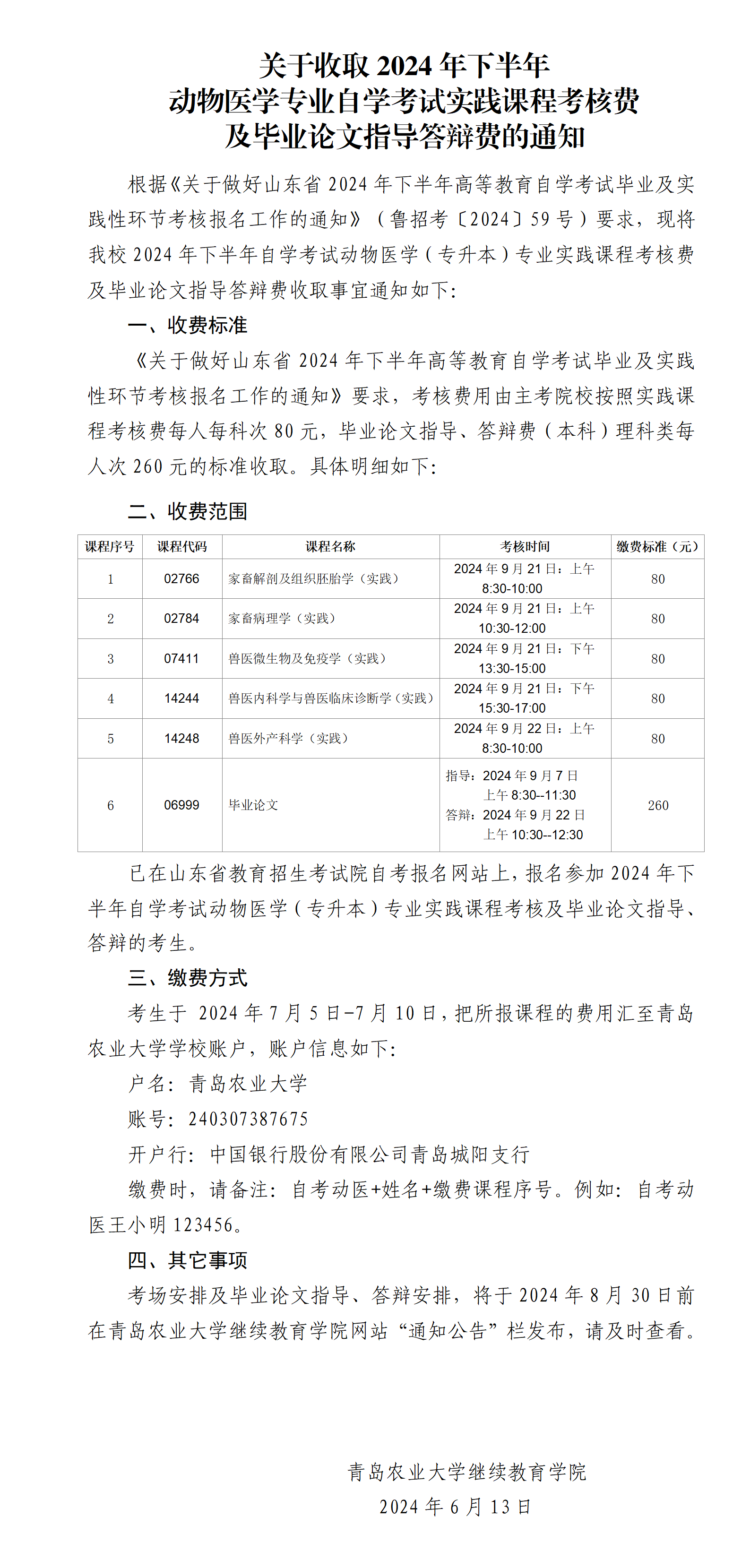 2024年下半年青岛农业大学动物医学专业自考实践课程考核费及毕业论文指导答辩费缴费通知1