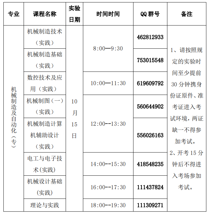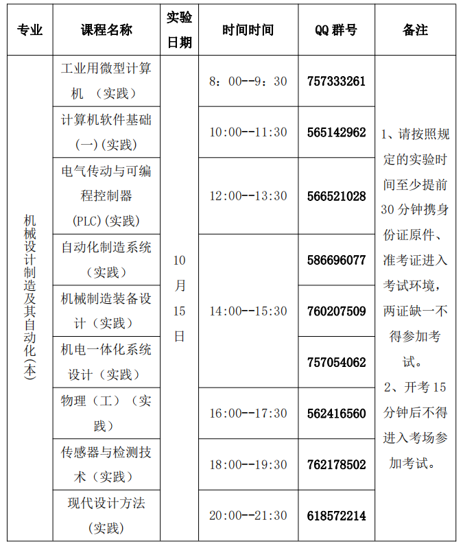 本次机械制造及自动化(专科)、机械设计制造及其自动化(专升本)的实践课考试采取网上考试形式,具体考试方式及要求会在各科QQ群内通知说明,请各位考生尽快申请进入所报考科目对应的QQ群,群号在下表中。(注意:申请进群时请务必注明真实姓名)