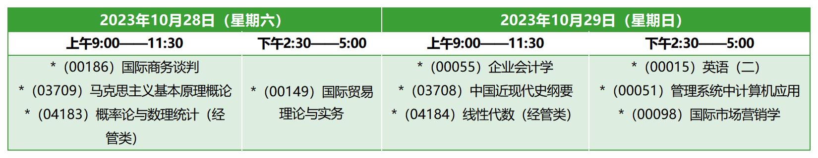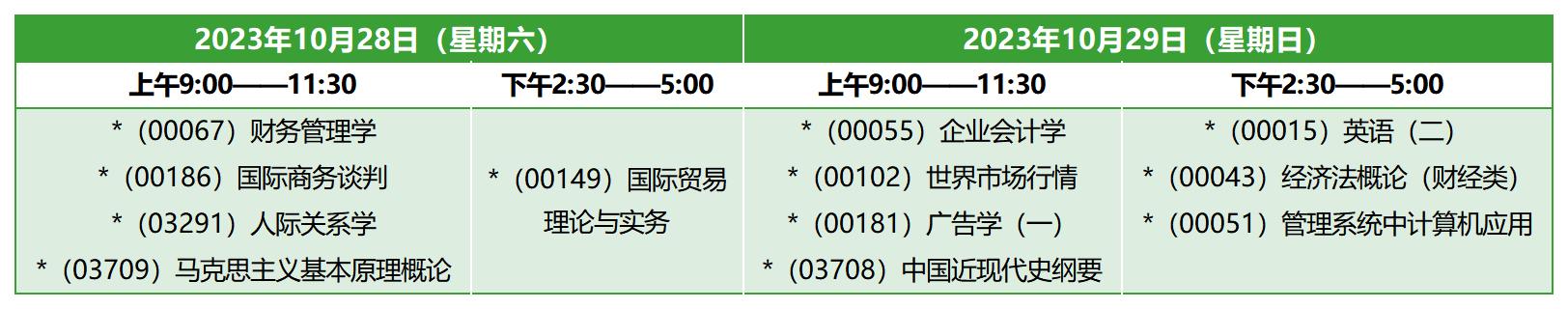 原专业市场营销本科,专业代码120202,主考院校上海财经大学,2023年10月自考考试时间为10月28日-29日、11月4日,上午9:00-11:30,下午14:30-17:00,该专业本次考期共开考10门课程,在11月4日没有安排课程考试,具体课程考试时间安排如下: