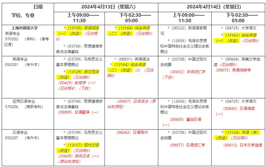 2024年4月上海外国语大学自考各专业课程考试日程安排表