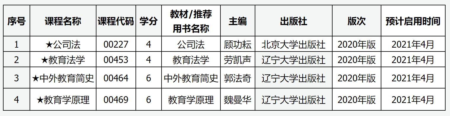 根据教育部考试中心函件精神,对《公司法》(课程代码00227)、教育法学(课程代码00453)、中外教育简史(课程代码00464)和教育学原理(课程代码00469)等4门全国统考课程教材进行更新,此次更新的4门统考课程教材将从2021年4月起开始使用,请广大考生按照新教材目录合理安排复习。