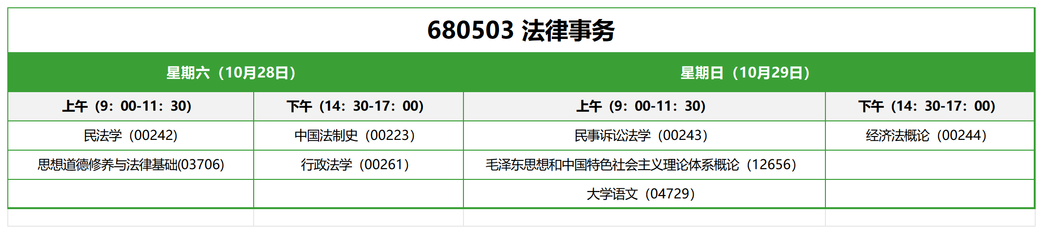 想要备考2023年10月的山西自考的学员们,如果您选择法律事务专科,请注意报考时选择专业代码为680503。考试安排在10月28日-29日,上午和下午各有一科,分别为9:00-11:30和14:30-17:00,共计可以考试4科。