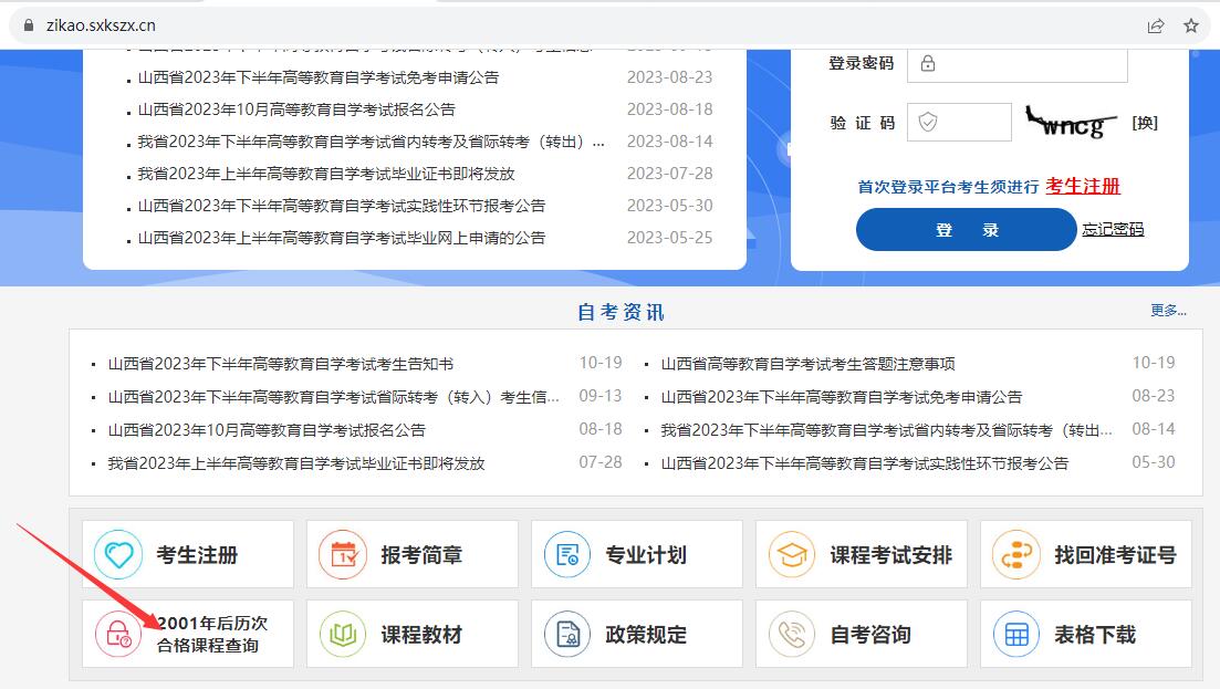 没有注册过该官方平台的账号?这样的考生想要查询历年成绩,也可以直接在平台左下角小模块-“2001年后历次合格课程查询”中,通过核验准考证和身份证、验证码来查询。