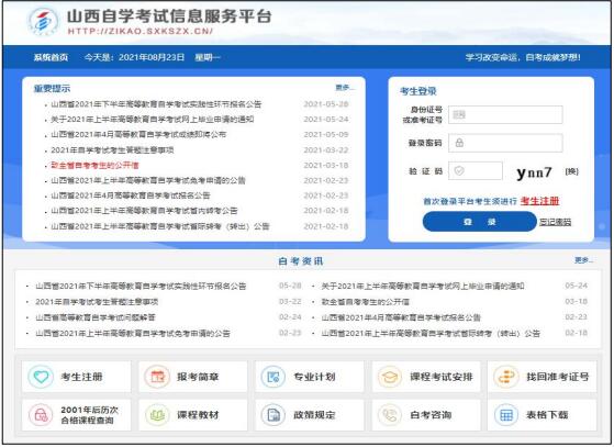 二、进入“山西自学考试信息服务平台”,考生可以通过“身份证号或准考证号”+“密码”登录系统。未获得登录密码的在籍考生需要进行考生注册。