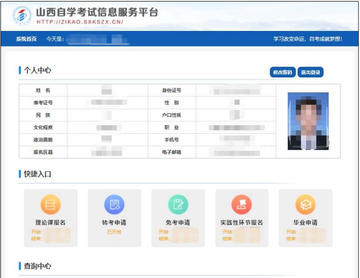 四、个人中心,考生身份认证通过后即可登录系统,登录成功后进入“个人中心”。考生可通过快捷入口和查询中心办理相关业务。