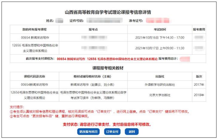 4、保存成功后查看本次报考信息详情,再次核对报考信息和理论课程。核对无误后点击“订单支付”,进行网上缴费。注:点击“订单支付”按钮后考生报考信息将不可修改。