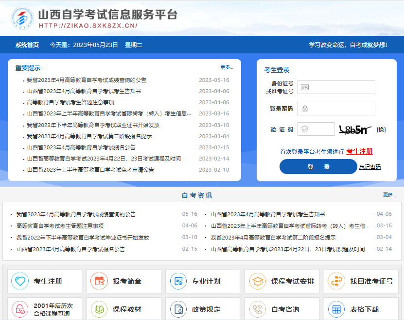 二、进入“山西自学考试信息服务平台”,考生可以通过“身份证号或准考证号”+“密码”登录系统。首次报考的新生需要先进行考生注册,未获得登录密码的在籍考生也需要进行考生注册。