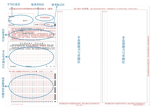 答题卡卡面包括手写信息区;贴条形码区;缺考标记区;注意事项区;考生笔迹确认区;选择题填涂答题区;非选择题书写答题区等部分。样卡如下: