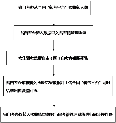 (一)省自考办收到转出地省级考办通过全国“转考平台”递送给我省的转入考生电子档案后,于规定日期内,将转入信息导入省考籍管理系统。