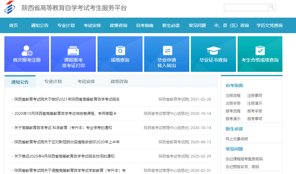 由于陕西自考专业计划所包含的科目不同,所以考试需要的教材也不同。考生可登录陕西省高等教育自学考试考生服务平台(如下图)查看报考专业的专业计划及课程教材。