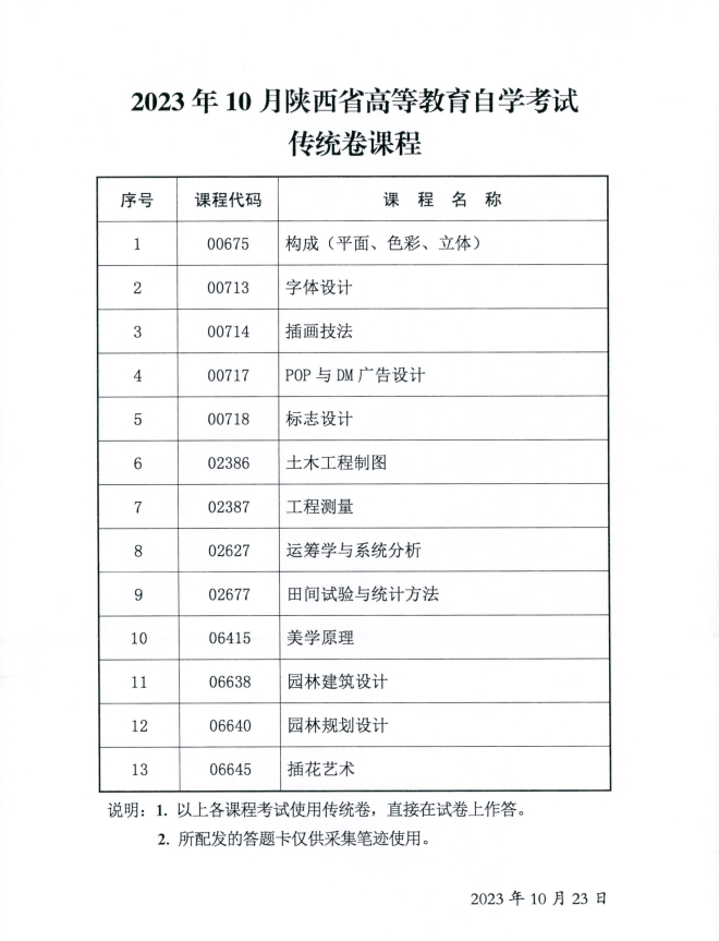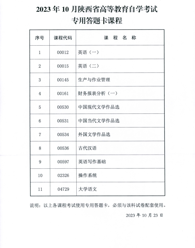 2023年10月陕西省高等教育自学考试传统卷课程、专用答题卡课程信息2