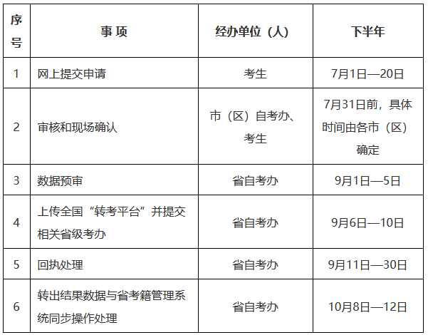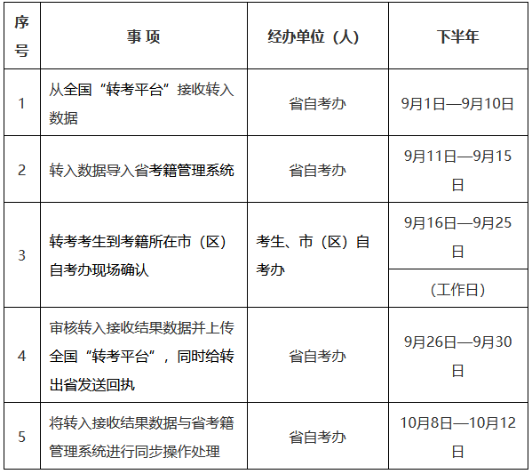 1.转入考生应及时关注转出省考生服务平台本人转考信息,转出成功后,在规定日期内,到我省考籍所在市(区)自考办办理转入确认手续。