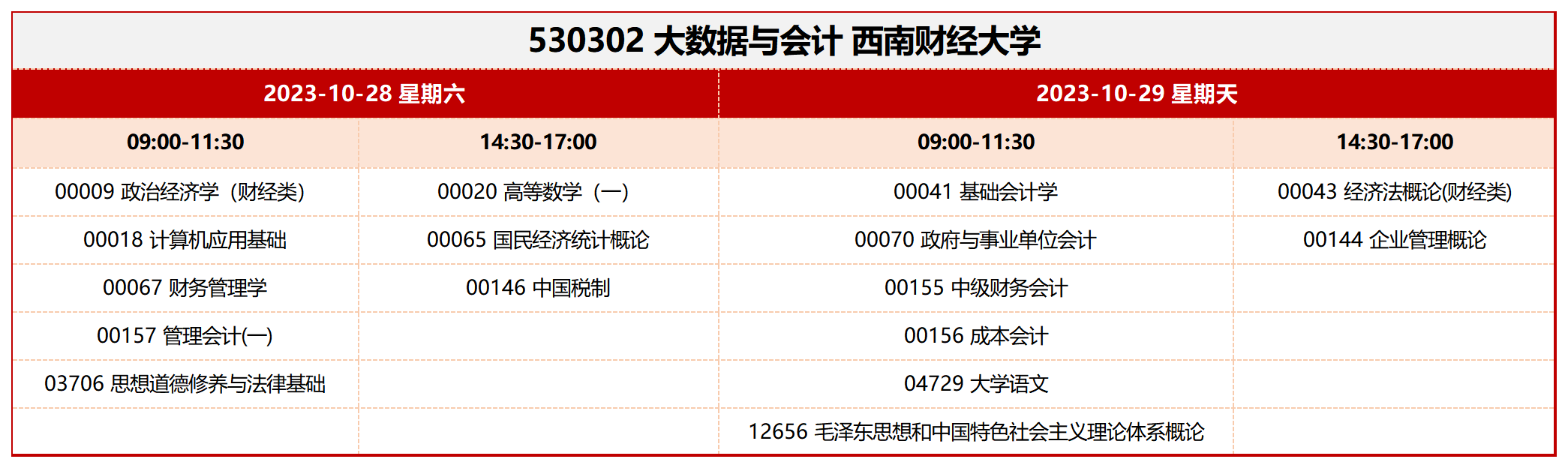 按照本次考试安排,考生可在2天内参加4场考试,报名报考本专业的考生只需认准西南财经大学-大数据与会计-专科,专业代码为530302(考试安排中为原专业代码H630302)。