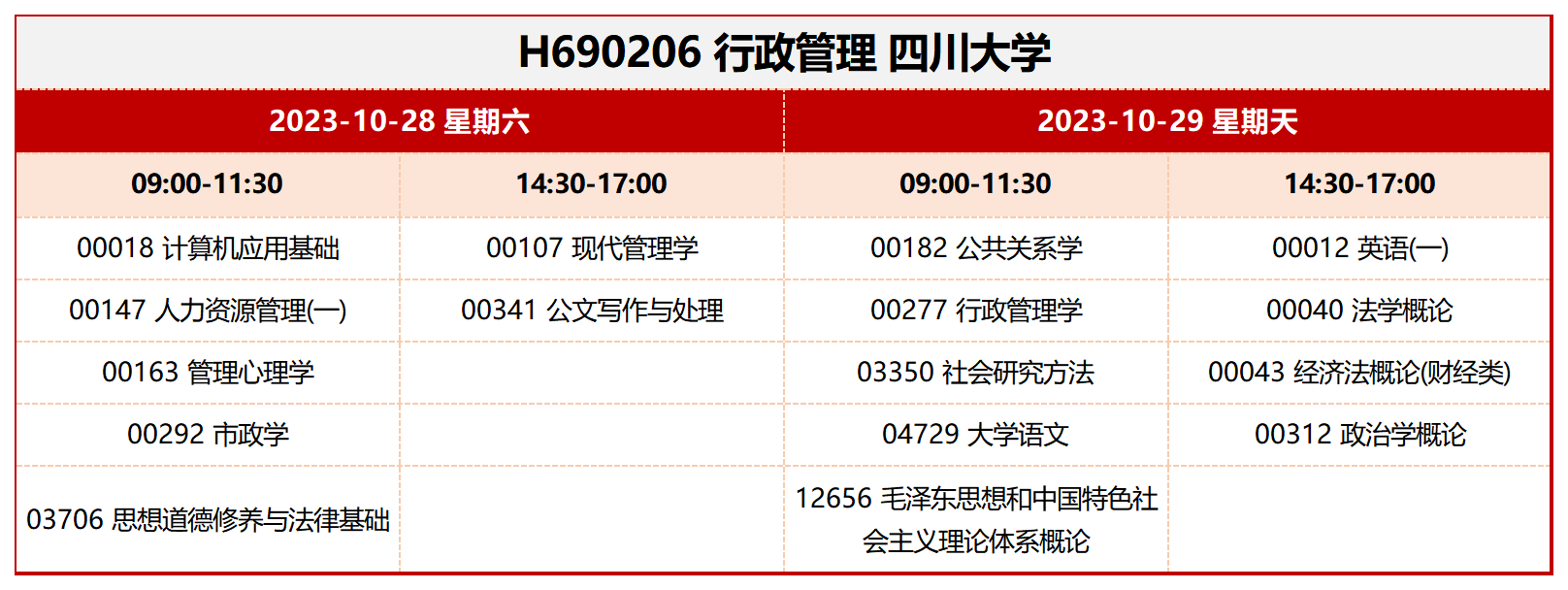 按照本次考试安排,考生可在2天内参加4场考试,报名报考本专业的考生只需认准四川大学-行政管理-专科,专业代码为590206(考试安排中为原专业代码H690206)。