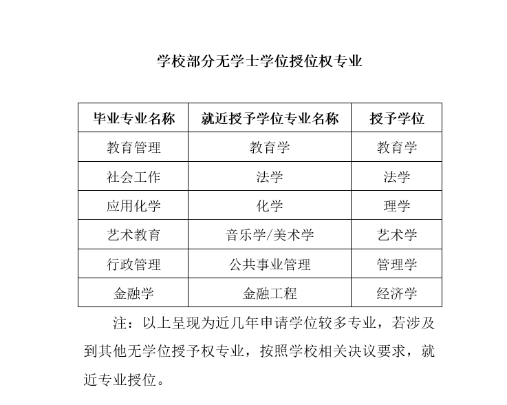 按照《国务院学位委员会关于印发〈学士学位授权与授予管理办法〉的通知》(学位〔2019〕20号)相关要求,自2022年起学校不能对无全日制本科授位权的专业进行自考相应专业的学士学位授位。为满足以往考生工作需求,经学校研究决定,对我校无权授位的自考本科专业进行相近专业授位并延期至2024年9月,且为最后一次接收无学士学位专业的学位申请。