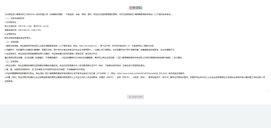在注册须知页面,考生需仔细阅读相关信息,阅读完成后,点击“我已阅读并同意”按钮,进入注册信息页面。