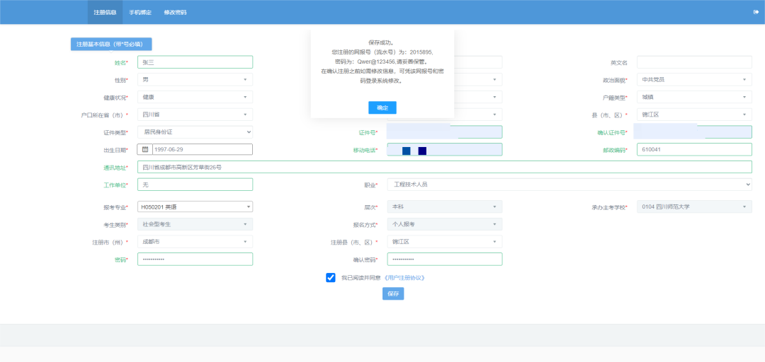 (二)勾选“我已阅读并同意用户协议”,然后点击“保存”按钮以保存考生基本信息。