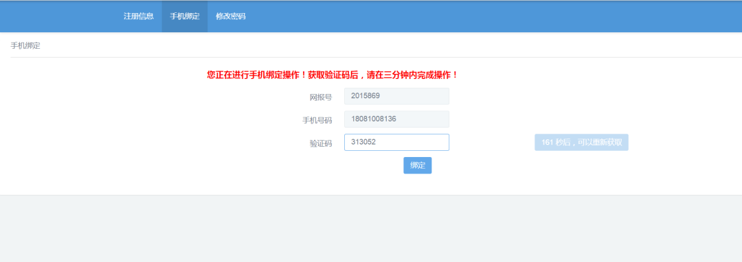 (三)信息保存成功后,系统生成网报号,系统自动跳转至手机绑定页面,若无跳转可手动点击页面的上方的“手机绑定”。