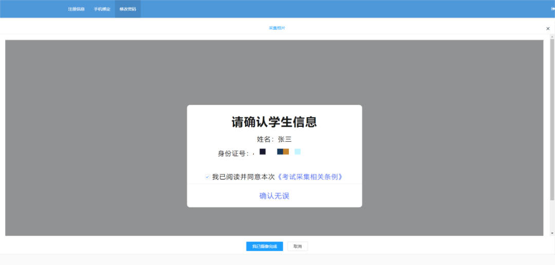 2.采集过程中,提示服务器繁忙,请考生刷新注册界面,重新扫码采集,持续出现问题则稍后再试或联系技术支持。