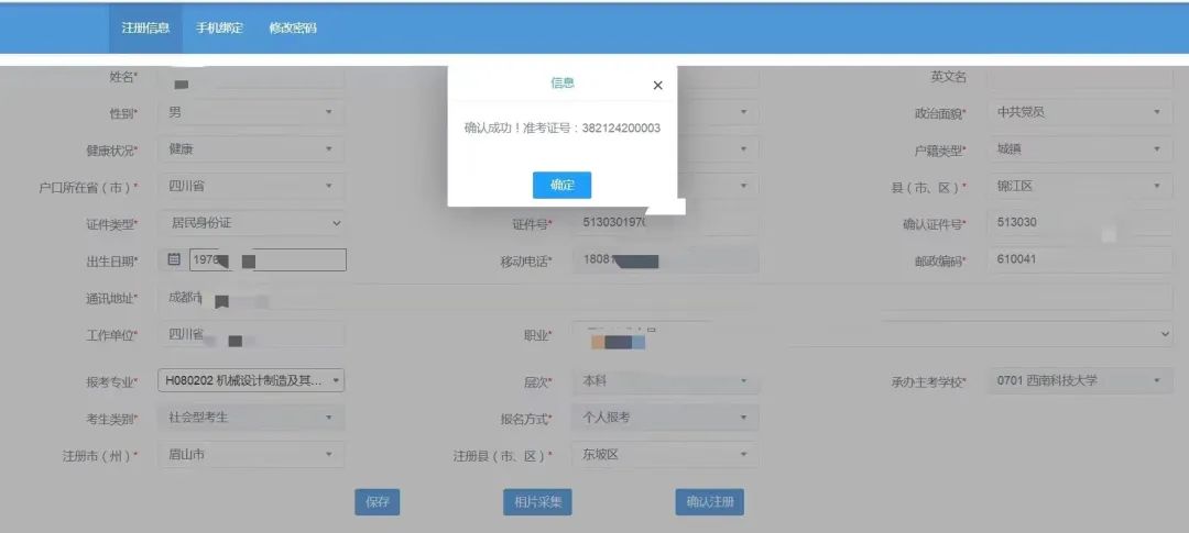 相片采集核验通过后,点击“确认注册”按钮,系统将生成考生的准考证号,注册流程完成。