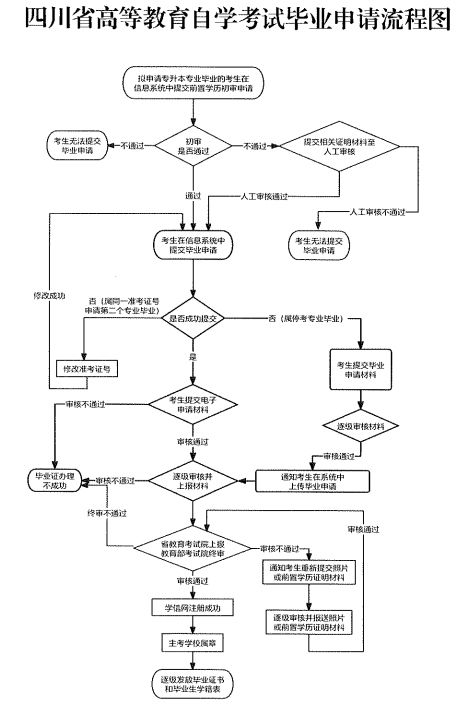 考生通过高等教育自学考试管理信息系统(以下简称信息系统)考生端(网址:http://zk.sceea.cn)提交毕业申请和缴纳毕业生审定费,并按要求提交电子版申请材料。凡未在信息系统考生端中完成毕业申请提交、缴费或申请材料不齐的考生,视为未完成毕业申请。若考生考籍信息不全或错误,应在规定时间内补全信息或申请更改考籍,更改正确后在下次毕业申请期间再次提交申请。