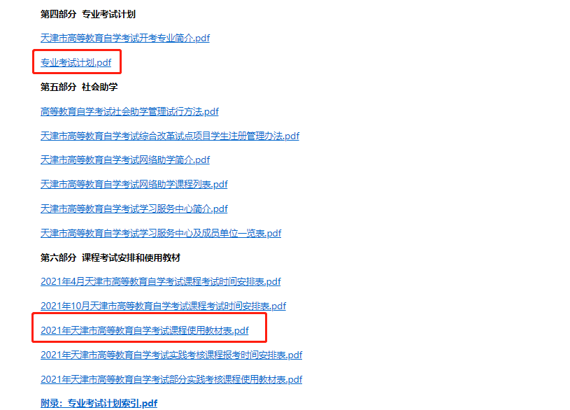 由于天津自考专业计划所包含的科目不同,所以考试需要的教材也不同。考生可登录天津招考资讯网自学考试栏目,找到2021年天津市高等教育自学考试考生手册第四部分 专业考试计划,或者点击→2021年10月天津自考专业及主考院校一览表,找到所报考专业的专业计划(如下图所示)。