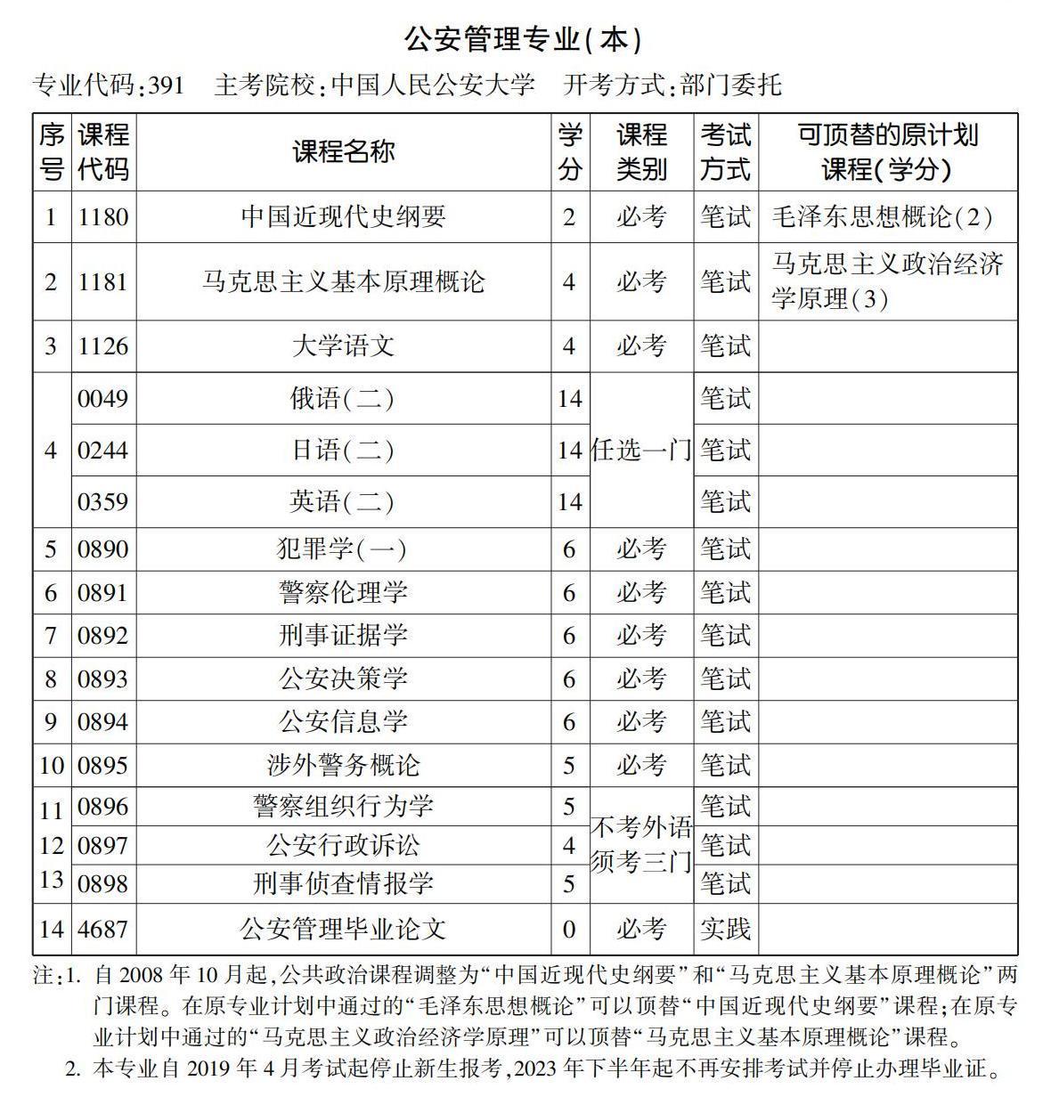 2022年10月天津自考本科公安管理专业计划(停考过渡)