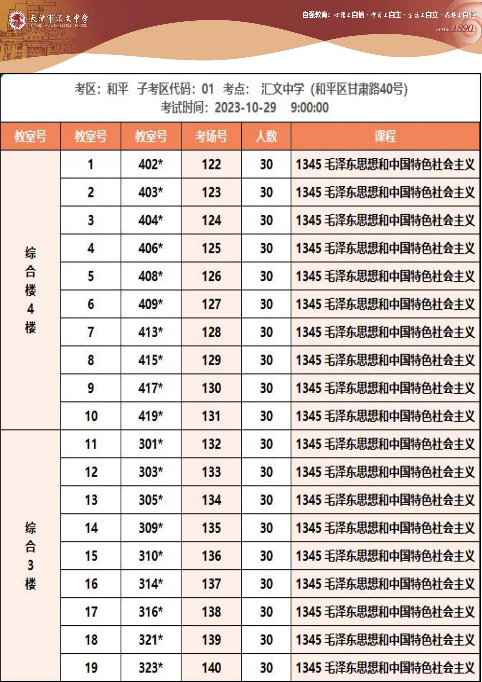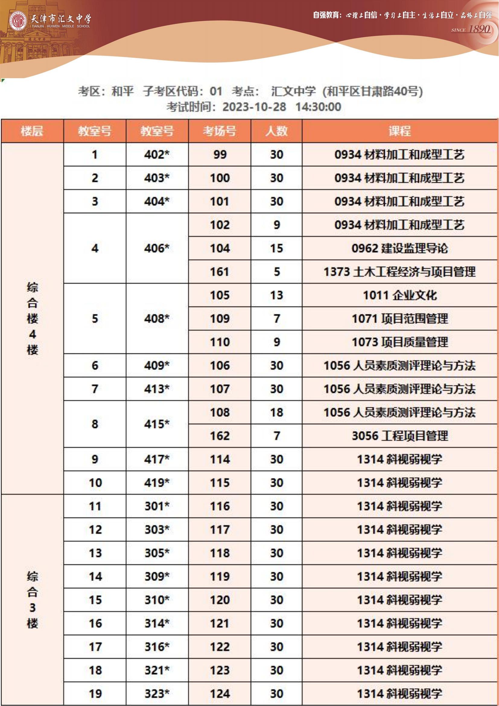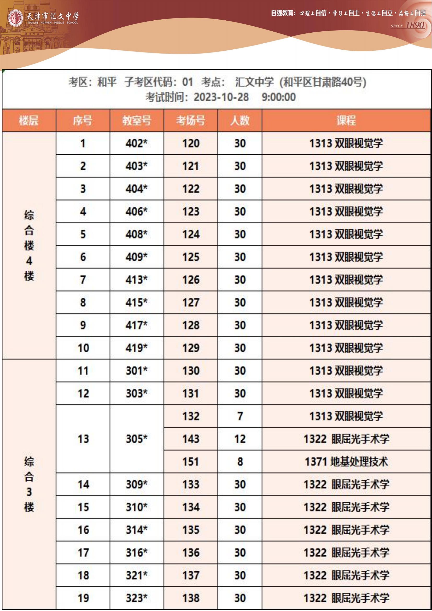 2023年下半年天津市和平区汇文中学自考考点考场示意图