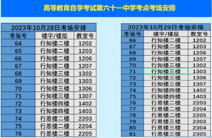 10月28日-29日举行的2023年下半年天津自学考试,共有18个考区40个考点,其中,天津市和平区共有6个考点,分别为汇文中学考点、第五十五中学考点、第十九中学考点、第六十一中学考点、第九十中学考点、新华职大考点,考生在考试之前需要提前熟悉考点考场,为此,自考365网校整理了第六十一中学考点考场分布示意图(点击下载附件),公布如下: