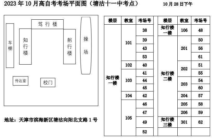 10月28日-29日举行的2023年下半年天津自学考试,共有18个考区40个考点,其中,天津市塘沽区共有2个考点,分别为塘沽六中考点、塘沽十一中考点,考生在考试之前需要提前熟悉考点考场,为此,自考365网校整理了塘沽十一中考点考场分布示意图(点击下载附件),公布如下: