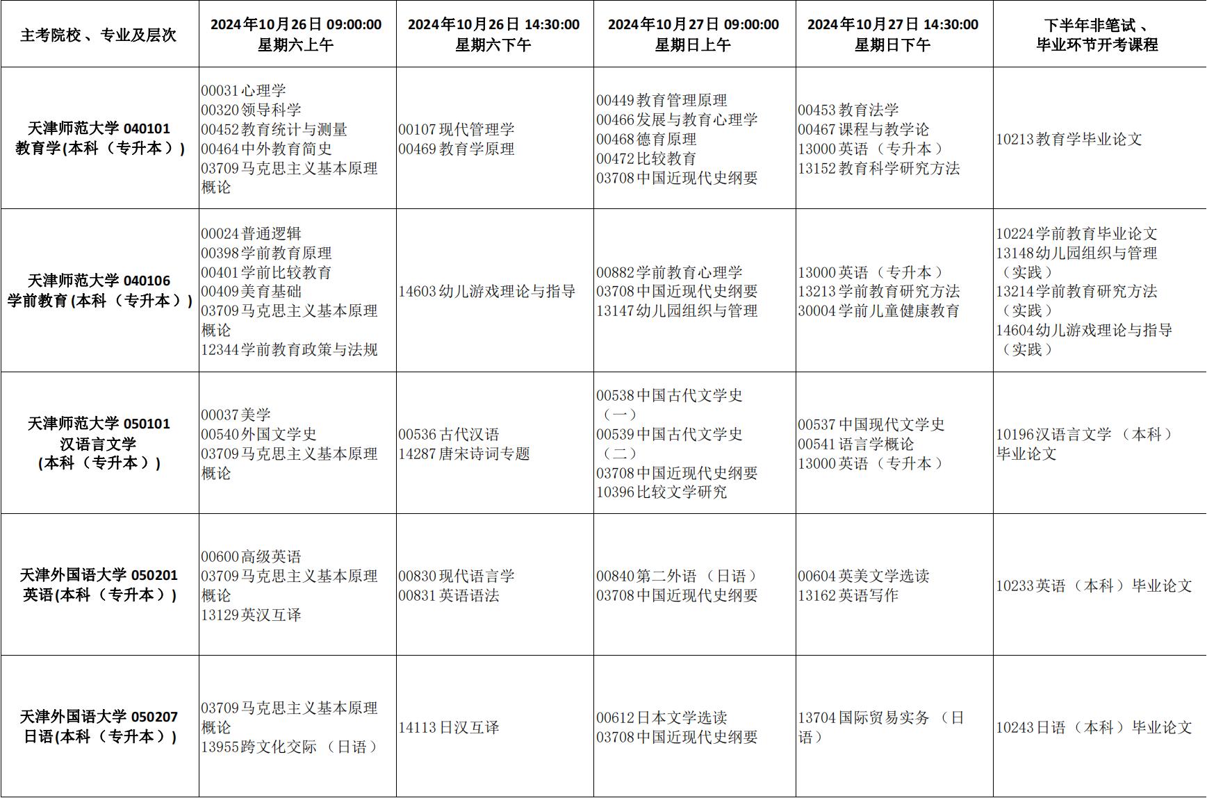2024年10月天津市高等教育自学考试课程考试时间安排表