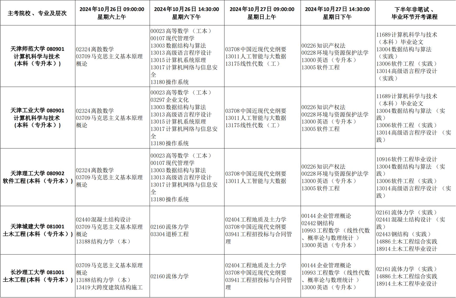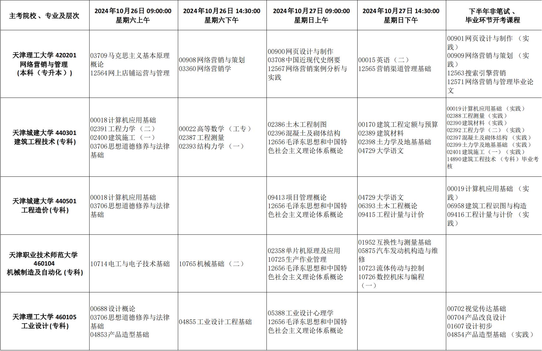 - 2024年10月天津市高等教育自学考试课程考试时间安排表