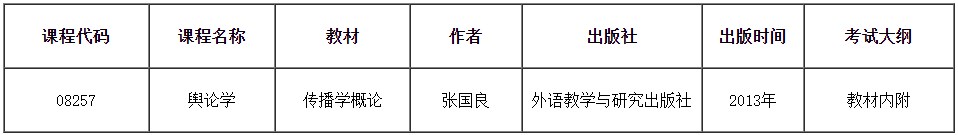 根据教育部教育考试院通知要求,2025年高等教育自学考试“舆论学”课程暂不安排全国统一命题考试,改为市命题考试,调整后教材、考试大纲信息如下: