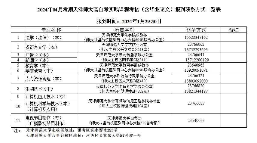 2024年04月考期天津师大高自考实践课程考核(含毕业论文)报到联系方式一览表