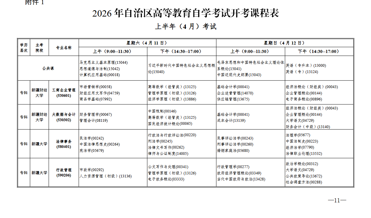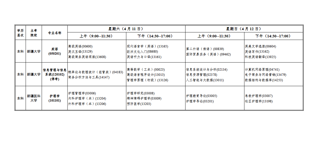 新疆维吾尔自治区2026年4月全国高等教育自学考试开考课程表
