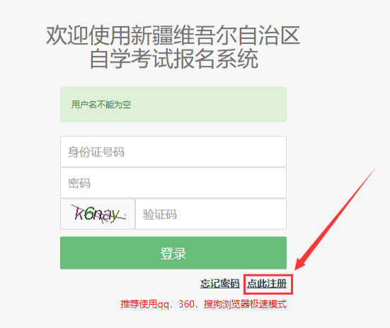 1、考生打开新疆教育考试院,在下方“公众服务大厅”中找到“网上报名”-“高等教育自学考试报名”,即可进入自考报名报考系统登录页面,点击“点此注册”按钮。