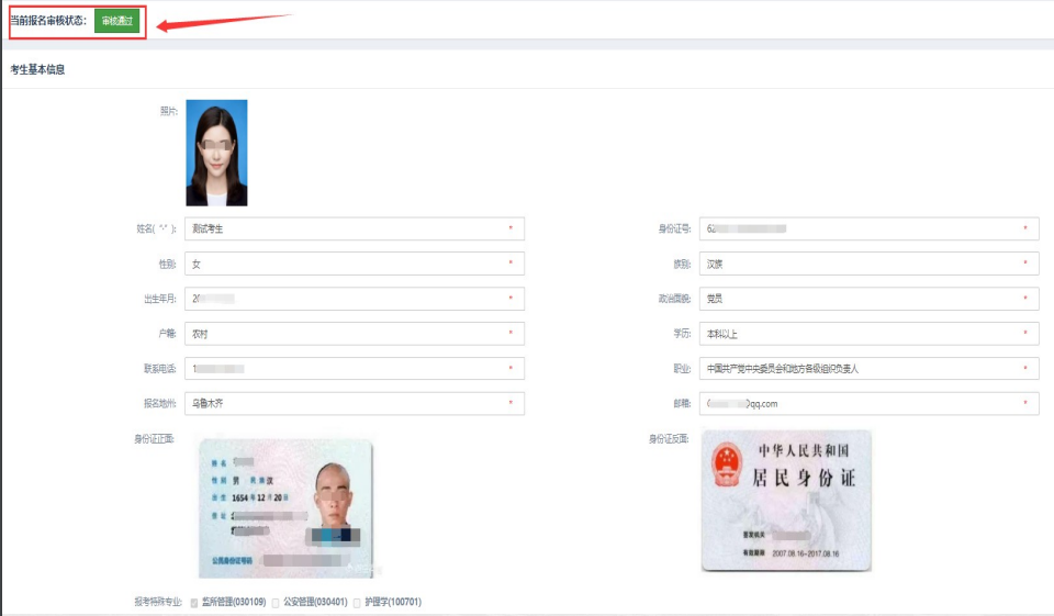 ②若考生审核通过,则无法再修改任何信息。若审核未通过,审核状态栏会提示审核未通过原因,考生根据原因可修改信息并重新提交等待审核。