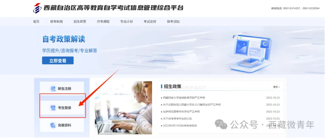 一、登录西藏自治区教育考试院官网点击“西藏自治区高等教育自学考试信息管理综合平台”进入首页。