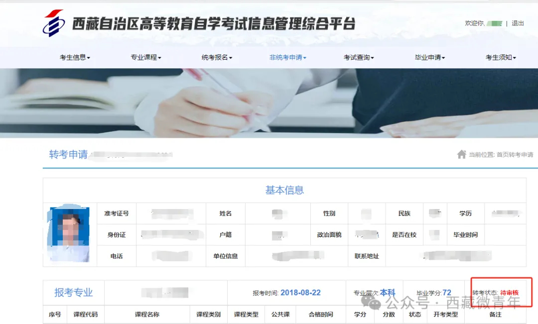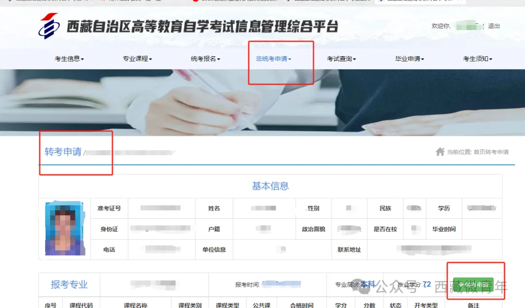 三、查询个人转考状态。登录“西藏自治区高等教育自学考试信息管理综合平台”→点击“非统考申请”→“转考申请” →“点击转考申请”→“转考信息页面”。
