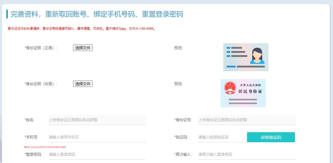 考生在本页面输入本人姓名、身份证号、准考证号、页面验证码,重新找回密码。