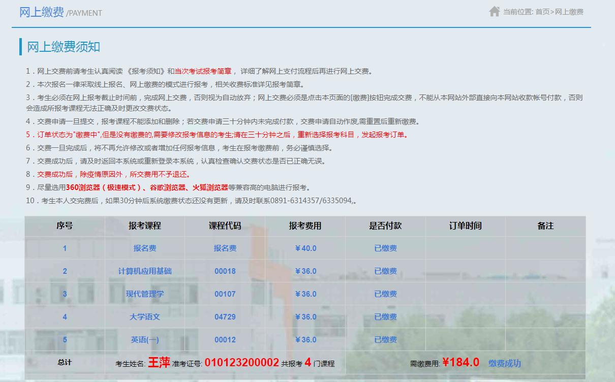考生报考时切勿重复缴费,费用一旦缴纳成功概不退费。