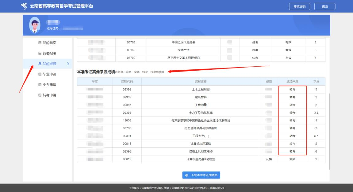 第三步:等待云南省接收,转入成功的成绩在公告时间后,考生可登录系统,在“我的成绩”查询对应转考成绩信息。