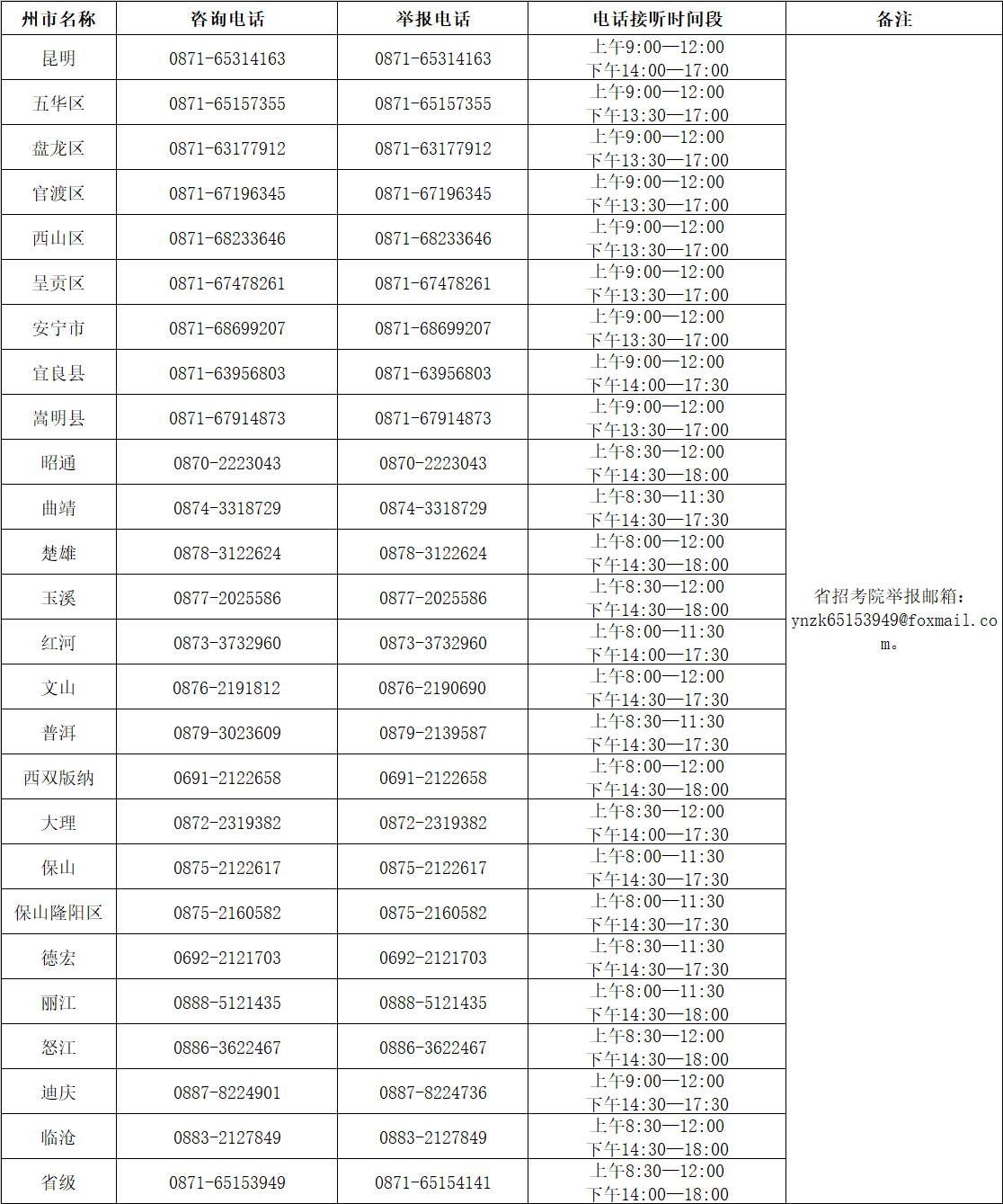 2024年下半年云南省第92次高等教育自学考试咨询及举报电话(10月26—27日)