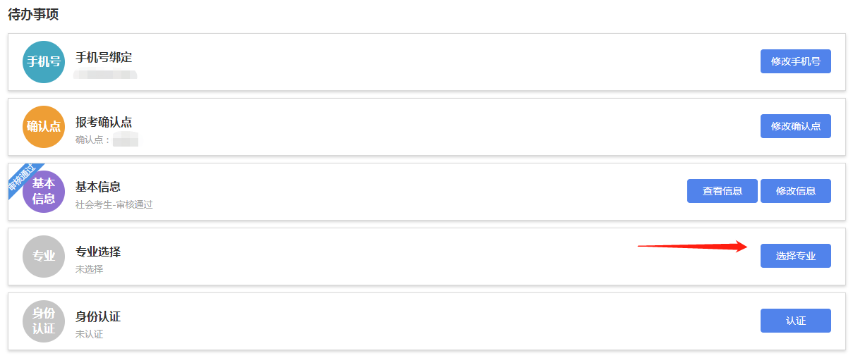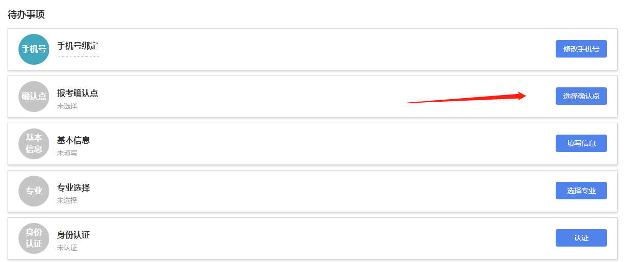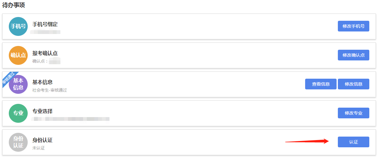 考生首次进入新系统后,需要点击“我的首页”填写代办事项内容,完善后方可进行报考、免考、转考、毕业申请等其他操作。