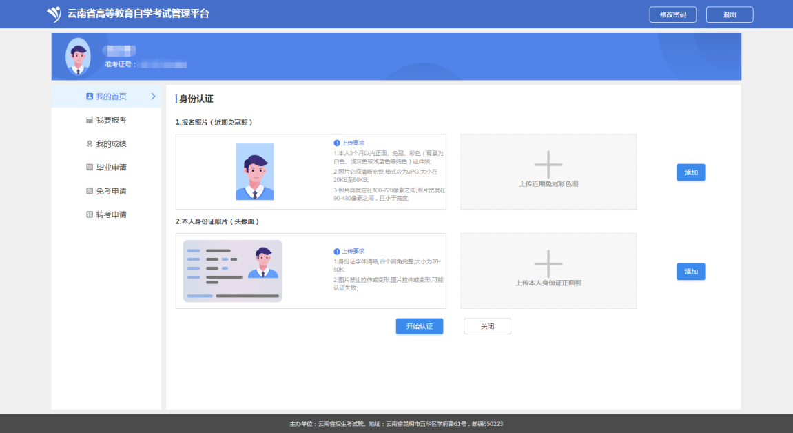 (1)普通考生,点击“添加”,分别上传报名照片(近期免冠照)、本人身份证照片(头像面),上传成功后,点击“开始认证”,认证过程中,会与可信来源进行考生身份认证认证内容为: