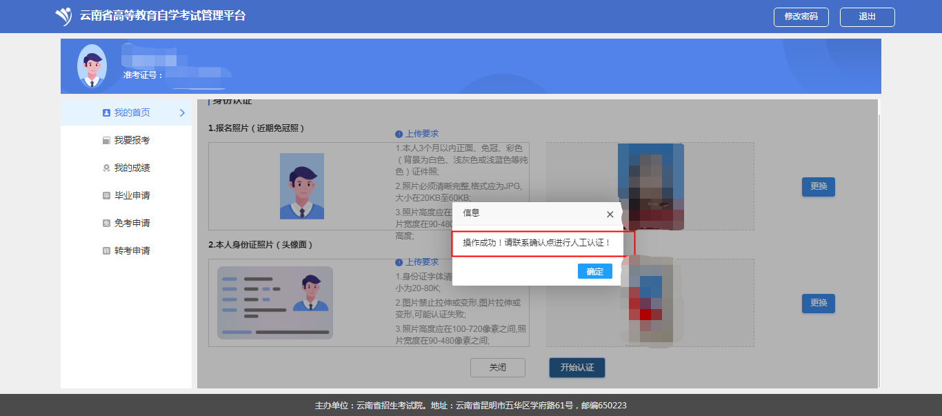 (2)特殊考生,点击“添加”,分别上传报名照片(近期免冠照)、本人证件照片(在上传身份证照片的位置上传),上传成功后,点击“开始认证”,系统会提示,操作成功,请携带相关材料联系确认点进行人工认证。