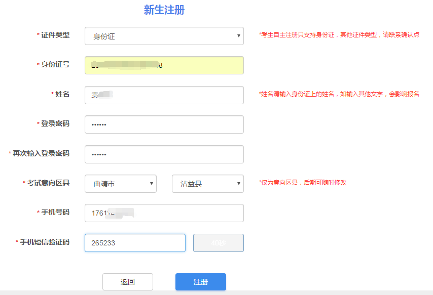 按要求进行输入,即完成注册,注册后,牢记系统生成的准考证号,使用生成的准考证号+密码进行登录。