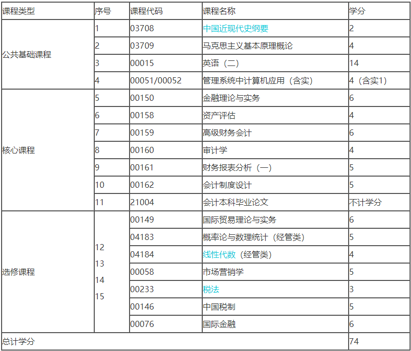 浙江自考会计学本科毕业需考过16门课程(如下图所示),其中,10门必考笔试课,4门选修笔试课,还有1门实践课程和会计学本科毕业论文。(直通车→2021年10月浙江自考专业及主考院校一览表)