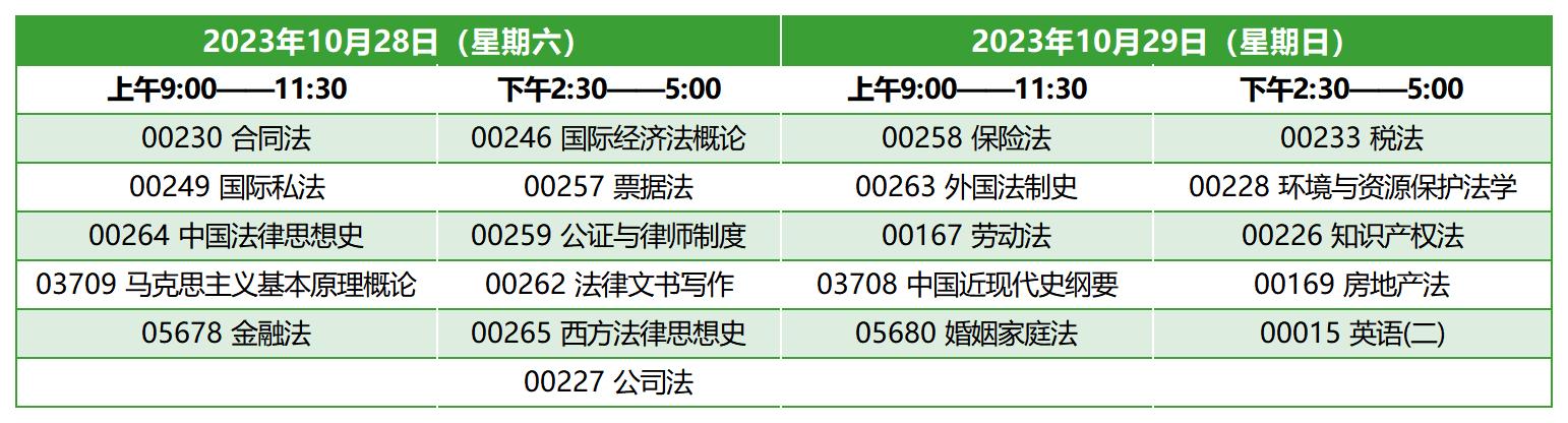 浙江自考本科法学专业(原专业名称:法律),专业代码030101K(原专业代码:1030106),2023年10月自考考试时间为10月28日-29日,上午9:00-11:30,下午14:30-17:00。